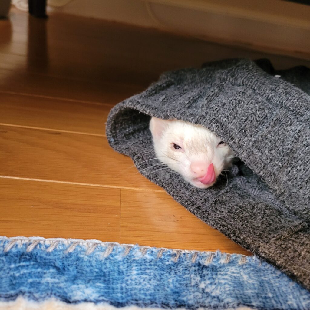 ちょろは一日のほとんどを寝て過ごしているのですが(フェレットとはそういう生き物です)私が家にいる時はケージの扉を開いて放し飼いにしています。